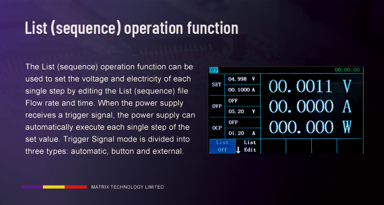 • List Sequence Output: Enables editing of 0-99 steps with configurable voltage, current, and duration parameters. Supports three trigger modes (automatic, key-triggered, external) and up to 99999 cycles (0 for infinite loop), suited for periodic testing scenarios.